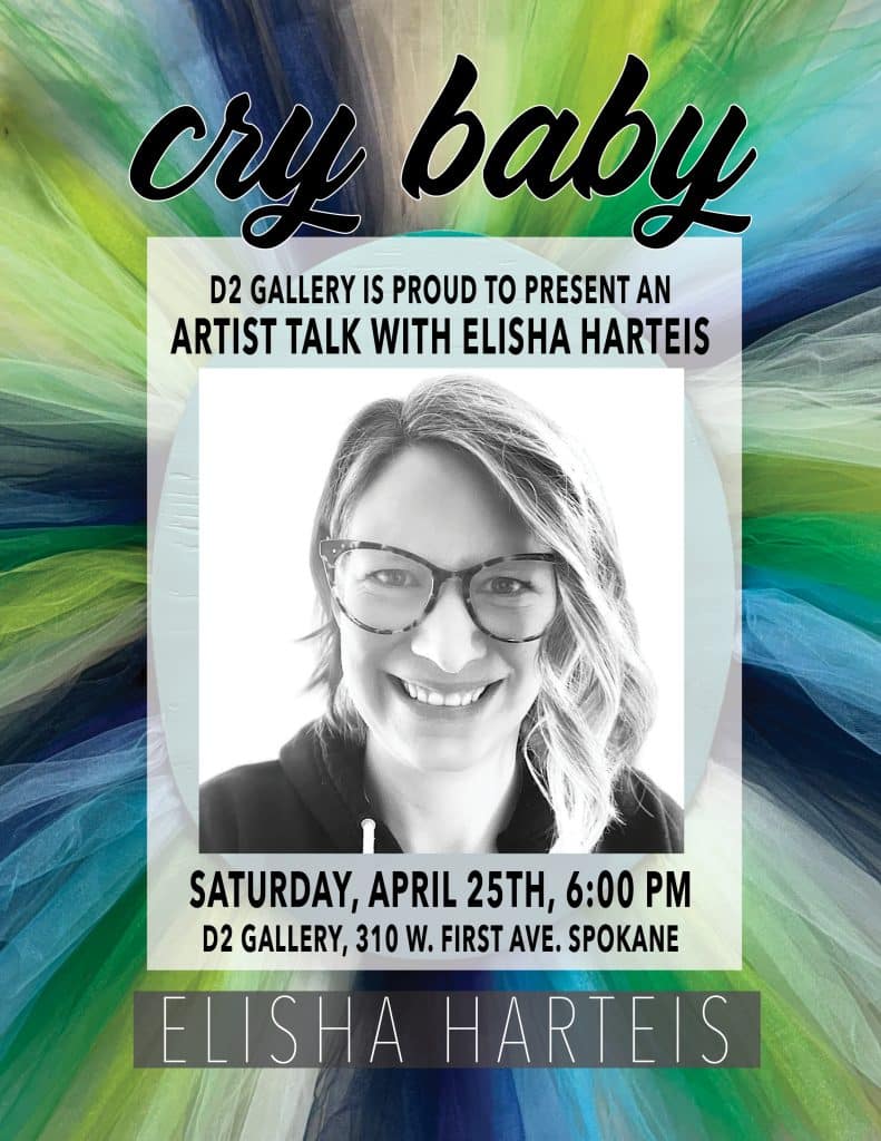 On April 25th, at 6:00, Missoula artist Elisha Harteis will be back in town to give our first ever Final Saturday Artist Talk! This will be a great opportunity to meet Elisha, ask her about her stunning exhibit “Cry Baby”, hear her talk about the concepts and motivations behind her work, and get one last chance to see this exhibit. “Cry Baby” is currently on display Wednesdays and Thursdays from 11 to 5:30, Fridays and Saturdays from 11 to 6.