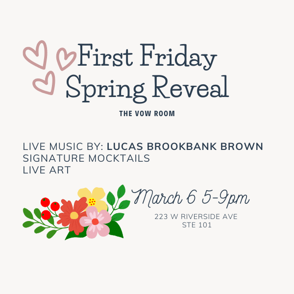 The Vow Room Spokane welcomes you to our spring decor reveal party on the First Friday in March, 2026.